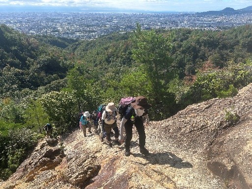 山岳会主催の「体験ハイク」が六甲・芦屋ロックガーデンにて開催され、会員9名、一般参加者7名の計16名が参加しました。午前9時過ぎに阪急芦屋川駅を出発し、高座ノ滝、風吹岩を経て七兵衛山へ向かう予定でしたが、予報に反して小雨が続き、眺望はあいにくの視界ゼロ。やむなく七兵衛山登頂は断念し、森の中の休憩スペースで昼食をとりました。
