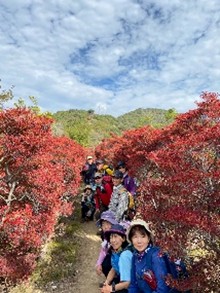 昨年に引き続きみかん狩りハイク2回目、知る人ぞ知る雨女リーダーの私ですが、今回は3日前から「晴れ確定!」という幸せな事態に。さて当日、ドウダンツツジの紅葉はあと一息という具合でしたが十分に赤く染まっていて見事でした。