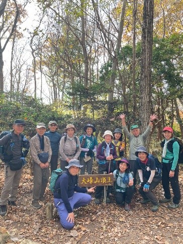 コース・タイム:阪急山本駅改札口8:30-広場での体操後出発8:40-最明寺門9:00-ロックガーデン取り付き9:20-満願西山10:07-中山山頂11:21(昼食)-11:50出発-大峰山登り口12:32-大峰山山頂13:34-桜の園14:22-東屋ティータイム-大峰山登山口下山15:10解散