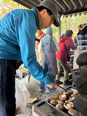 さて、催事の方はK会長の開会宣言を皮切りに乾杯、そして万全に準備された食材が振舞われました。ウェルカムフランクフルト・おでん・寄せ鍋(豚汁ではないです・・・(-_-;)目指してく黒山の人だかり状態。そしてトリはSさんの農園で大切に育てられた巨大シイタケの差し入れで大盛り上がりでした。(Sさん、カンパありがとうございました!)最後に昨年好評だったサリ麺で仕上がりました。