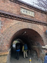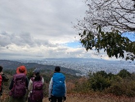駅を出てすぐに「ねじりまんぽ」と言われるトンネルをくぐります。蹴上疎水公園で体操をして出発、15分ほど歩いて日向大神宮に着くころには、衣服調整が必要なほどに汗をかいていました。京のお伊勢さんとも呼ばれる日向大神宮は内宮、外宮があり、雨に濡れたもみじの落ち葉とともに何とも言えない厳かな雰囲気がありました。すぐ先に天岩戸のくぐれる洞窟があり、皆、開運を祈願しながら通ります。雨上がりの少し靄がかかったような幻想的な木立の中、山頂を目指します。初冬の京都は、西宮に比べ肌寒いかな?と思うような気温でしたが、歩みを進めると、暑くもなく、寒くもなく、ハイキングにはちょうどいい気候だと感じました。